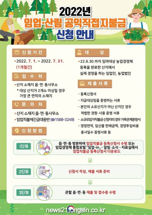 임업직불금을 신청하고자 하는 임업인은 오는 31일까지 임업직불금 등록신청서와 관련 서류를 산지가 소재한 읍ㆍ면ㆍ동 행정복지센터에 방문해 제출한다.