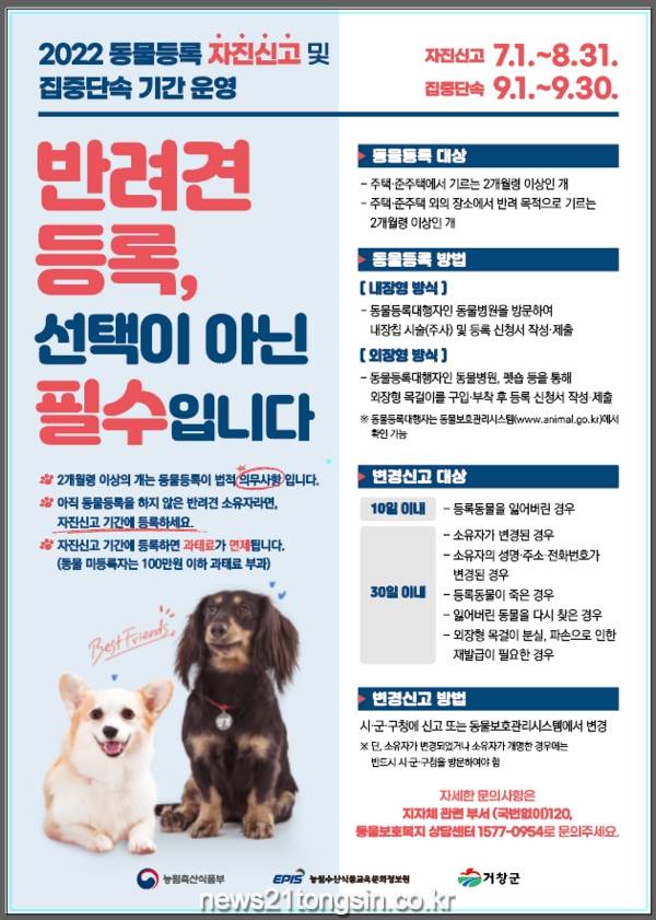 김규태 농업축산과장은 “동물등록 및 변경신고는 성숙한 반려동물 문화 정착과 유실· 유기동물 발생 예방을 위하여 꼭 필요한 것인 만큼 거창군민의 적극적인 참여를 당부한다”고 전했다.