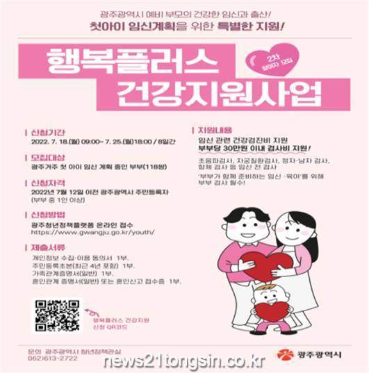 광주광역시는 첫 아이 임신을 준비하는 부부에게 건강검진을 지원하는 ‘2022년 하반기 행복플러스 건강지원사업’ 에 참여할 118쌍을 모집한다.