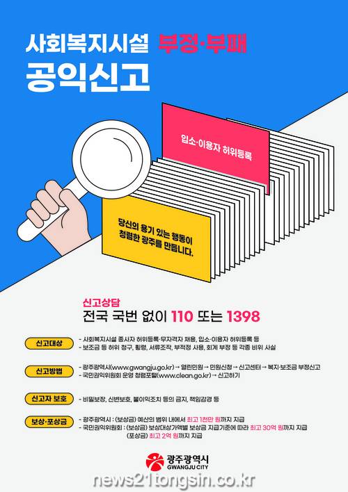 광주광역시는 사회복지시설의 투명성을 높이고 청렴문화를 확산시키기 위해 회계부정 등 불법·부당행위에 대한 공익신고제도 홍보를 강화한다.