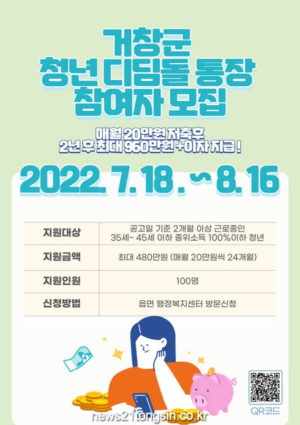 거창군은 청년들의 자산형성을 통해 지역의 안정적인 생활을 지원하여 거창의 당당한 구성원으로서 역할을 할 수 있도록 거창형 청년저축계좌 ‘디딤돌 통장사업’ 참여자 100명을 모집한다.