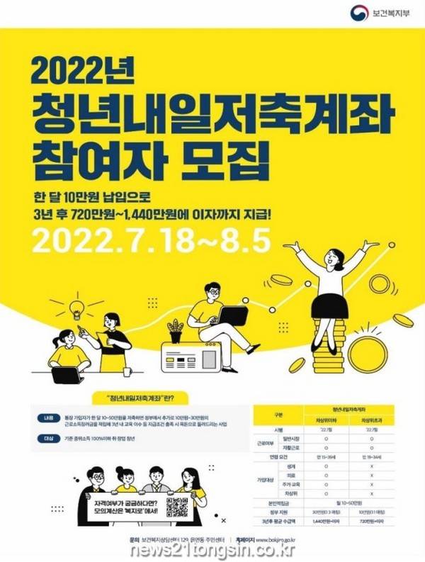 ‘청년내일저축계좌’ 신청 대상은 기초생활수급자(생계·의료·주거·교육급여), 차상위계층 및 기준 중위소득 100% 이하의 일하는 청년으로, 가구 소득·연령·근로 기준·가구 재산의 4개 조건이 모두 충족돼야 가입이 가능하다.
