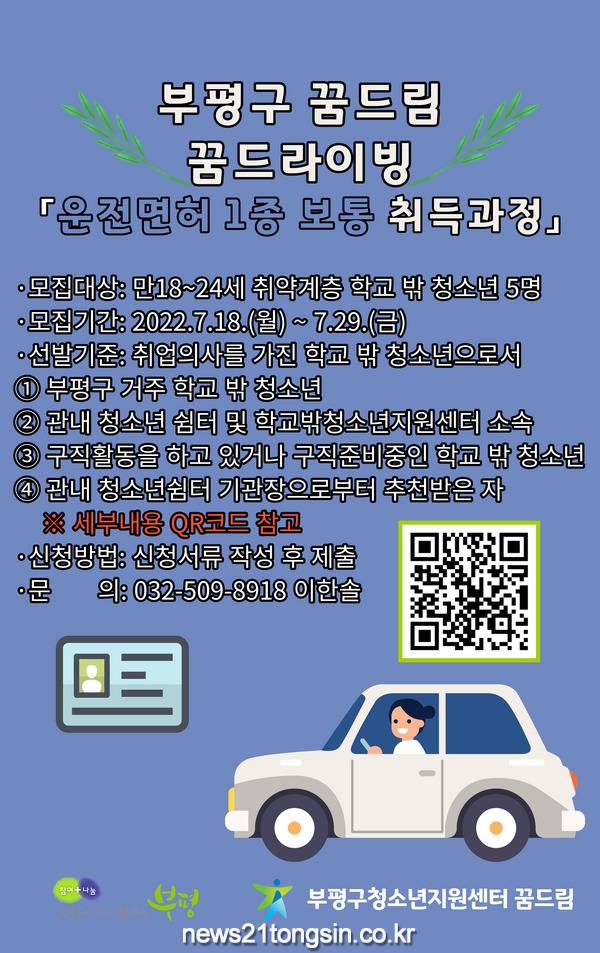 부평구(구청장 차준택)청소년지원센터 꿈드림이 오는 29일까지 ‘운전면허 1종 보통 자격취득과정’ 참여자를 모집한다.