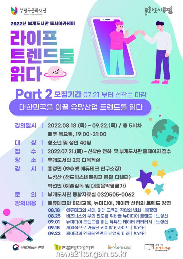 부평구(구청장 차준택)구립부개도서관이 오는 21일부터 2022 독서아카데미 ‘라이프 트렌드를 읽다: 새로운 시장의 흐름’ 강연 참여자를 모집한다.