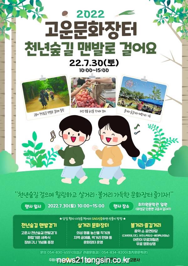 의성군은 오는 7월 30일 2022 고운사 천년숲길 문화장터 ‘천년숲길 맨발로 걸어요’를 개최한다. 의성군과 최치원문학관이 주최하고 대한불교조계종 16교구 본사 고운사가 후원하는 이번 행사는 최치원문학관 일원에서 오전 10시부터 오후 3시까지 열린다.