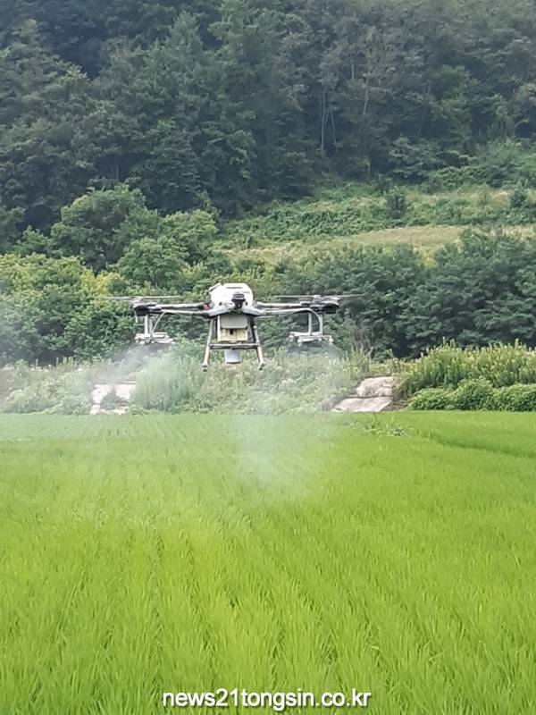경북 군위군은 농촌인구 감소와 고령화에 따른 일손부족을 해소하고 수도작 병해충 확산을 조기 차단하고 방제하기 위하여 19~24일 6일간에 걸쳐 군위군 전 지역 수도작에 대하여 드론 항공방제를 실시했다.