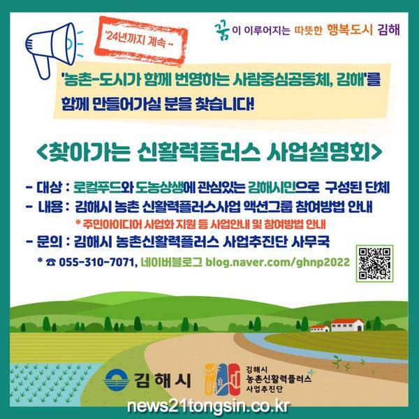 김해시(시장 홍태용)는 ‘농촌-도시가 함께 번영하는 사람중심공동체, 김해’를 만들기 위해 농림축산식품부 공모사업인 농촌 신활력플러스사업을 2024년까지 추진한다.