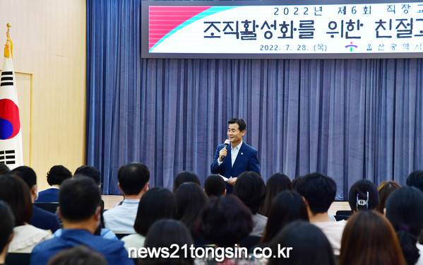 김영길 중구청장이 28일 중구컨벤션에서 ‘조직 활성화를 위한 친절과 공감 소통’이라는 주제로열린 제6회 직장교육에 앞서 인사말을 하고 있다.
