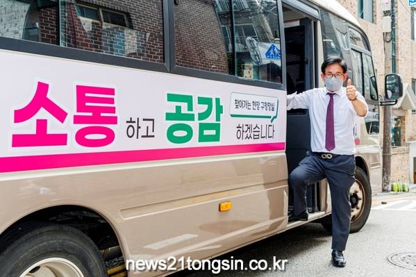 마포구는 구민의 어려움을 해결하고 정서적 피서지를 마련해주기 위해 발로 뛰는 소통 행정에 돌입했다고 밝혔다. 버스를 활용해 국장단, 감사담당관, 민원 관련 부서 팀장들과 함께 움직이는 ‘현장 구청장실’ 운영을 시작한 것이다.
