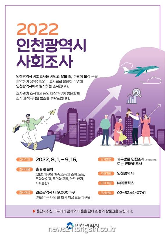 인천광역시는 오는 8월 1일부터 9월 16일까지 「2022년 인천광역시 사회조사」를 실시한다고 밝혔다.