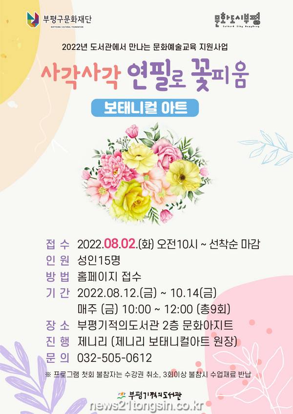 강좌는 꽃, 열매 등 식물의 세밀화를 그리는 보태니컬 아트와 나무를 깎아 실생활 도구를 제작하는 우드카빙으로 구성됐다. 모든 강좌는 지역주민을 대상으로 무료로 진행한다. 보태니컬 아트 신청은 오는 2일 오전 10시부터 부평구립도서관 홈페이지(www.bppl.or.kr/miracle)에서 선착순으로 접수하고, 우드카빙은 추후 공지 후 모집을 진행할 예정이다.