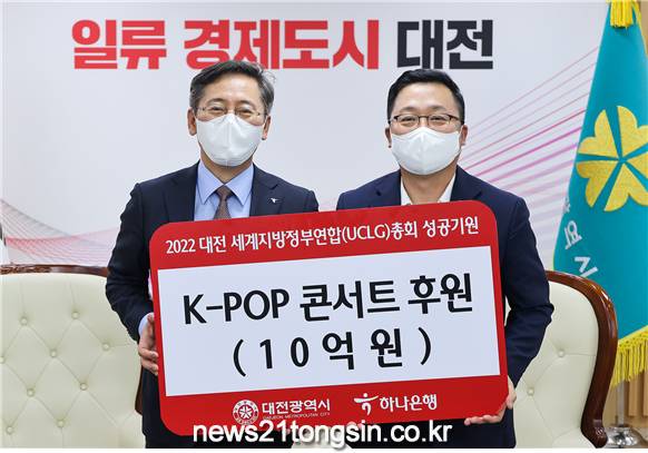 2022 대전 세계지방정부연합(UCLG) 조직위와 ㈜하나은행은 1일 대전시청에서 ‘하나대전사랑 K-POP 콘서트’개최를 위한 업무협약을 체결했다고 밝혔다.
