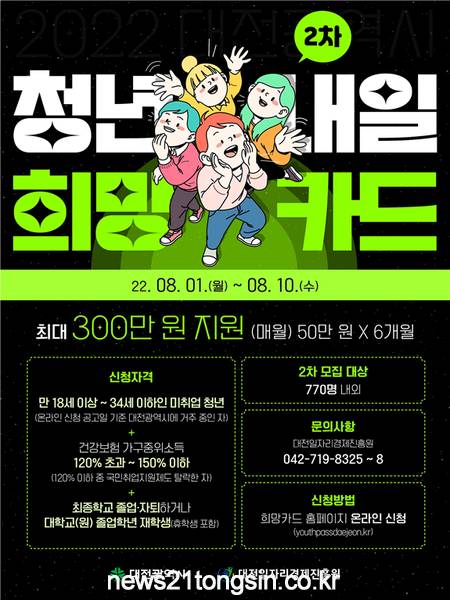 대전시는 미취업 청년의 구직활동 및 생활안정 지원을 위해 2022년 대전시 ‘청년내일희망카드’사업 참여자를 추가(2차) 모집한다고 밝혔다.
