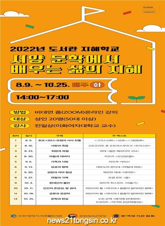 인천광역시는 문화체육관광부가 주최하고 한국도서관협회가 주관하는 「2022년 도서관 지혜학교」 공모사업에 선정됨에 따라 8월 9일부터 10월 25일까지 매주 화요일 총 12회에 걸쳐 중장년 대상 인문학 프로그램을 비대면으로 운영한다고 밝혔다.