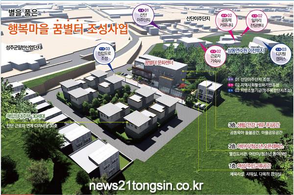 다음, 성주군의 ‘별을 품은 행복마을 꿈별터 조성사업’은 성주읍 금산리 성주일반산업단지 일원에 산업단지 입주기업 근로자 등의 정착 및 정주여건 개선을 위해 공공임대주택과 함께 생활기반시설을 확충해 정주자의 생활편익을 증대할 계획이다. 이를 위해 총사업비 121.8억원(국비25 군비44.8 민자 52)을 투입할 예정이다.