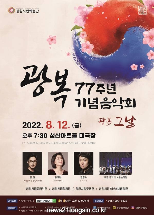 창원특례시(시장 홍남표)는 광복77주년을 맞아 특별기획공연으로 ‘창원시립예술단 “광복절 기념음악회”를 오는 8월12일(금)오후 7시30분 성산아트홀 대극장에서 개최한다’고 밝혔다.