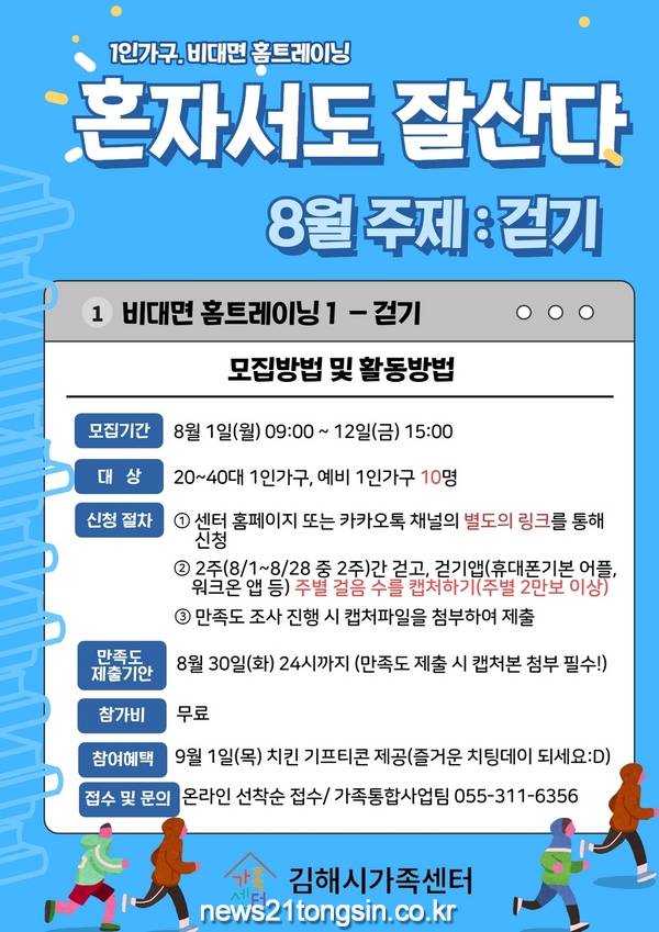 단, 비대면 홈트레이닝 ‘혼자서도 잘산다’는 8월 1일부터 12일까지 접수를 받으며, 대상자들은 8월 한달 동안 걷고, 2주간의 주별 걸음 수를 캡처하여 만족도 조사서를 제출하면 치킨 기프티콘도 제공받을 수 있다.