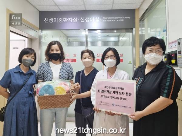 첫 작품은 신생아 모자다. 미숙아에게 모자를 씌우면 체온 1~2도를 높여 저체온증을 막을 수 있다. 작년 6월 모임을 시작한 이래 총 57개의 신생아 모자를 만들었고, 지난달 21일 지역 내 대학병원 2곳, 인제대학교상계백병원과 노원을지대학교병원에 전달했다.