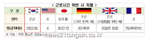근로시간 위반에 대한 처벌수준도 한국이 G5대비 가장 높은 것으로 나타났다. 한국은 근로시간 위반 시 2년 이하의 징역 또는 2천만원 이하의 벌금을 부과하고 있으나, 미국은 처벌 규정이 아예 없고, 프랑스는 벌금형만 부과, 독일은 원칙적으로 벌금형이나 근로시간 규제를 고의·반복적으로 위반할 경우에만 징역형을 부과하고 있다.