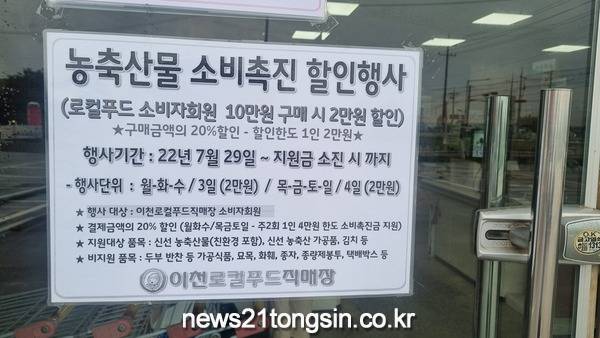 이천시는 지난달 29일부터 율현동에 소재해 있는 이천로컬푸드 직매장(대표이사 오광석)에서 지역 농축산물 소비촉진을 위한 할인행사를 추진한다고 밝혔다.