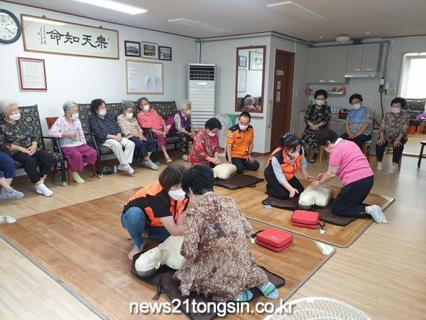 교육은 경로당 이용 회원에게 주변에서 일어날 수 있는 갑작스런 심 정지 로 의식을 잃은 사람을 살릴 수 있고 상황에 따라 대처할 수 있는 심폐소생술과 소화기 사용법 등에 대해 교육을 진행하여 호응이 높았다.