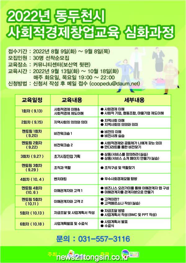 동두천시(시장 박형덕)는 오는 9월 13일부터 10월 18일까지 매주 화·목요일, 보산동 커뮤니티센터에서 진행되는 ‘2022년 동두천시 사회적경제 창업교육 심화 과정’ 교육생을 모집한다.