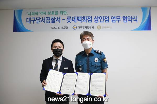 (뉴스21통신) 박창남기자 = 대구달서경찰서(서장 박만우)는 지난 8월 11일 롯데백화점 상인점(점장 박찬욱)과 사회적 약자 보호를 위한 업무협약식을 개최했다고 밝혔다.