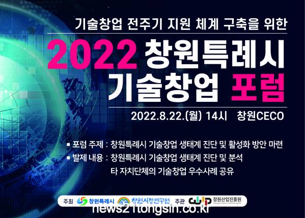 창원특례시(시장 홍남표)는 오는 22일 오후 2시부터 창원컨벤션센터에서 기술창업 전주기 지원체계 구축을 위해 기술창업 생태계 진단과 활성화 방안을 마련하고자 ‘제1회 창원특례시 기술창업 포럼’을 개최한다고 밝혔다.