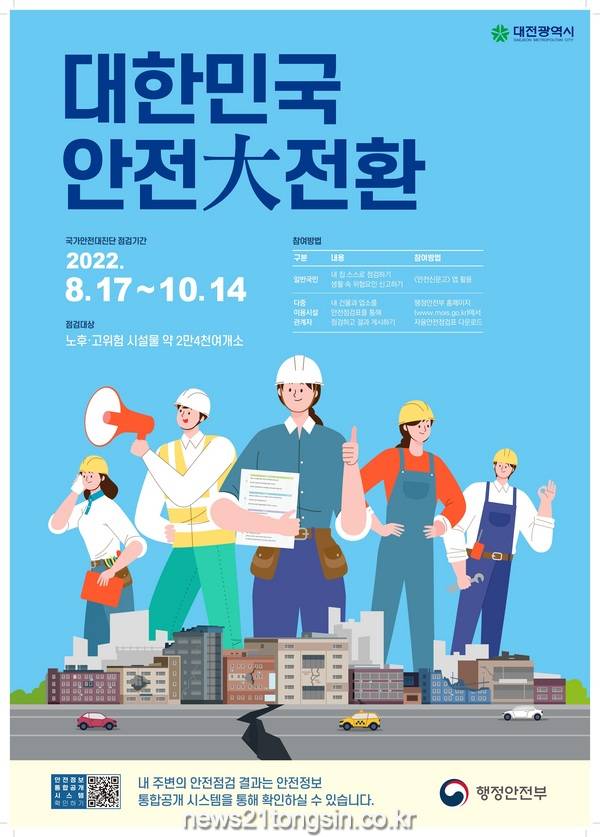 대전시는 오는 17일부터 10월 14일까지 ‘대한민국 안전大전환’일환으로 사회전반 시설물의 구조적 결함과 위험요인을 발굴하고 개선하기 위해 시민과 함께 안전취약 시설물을 집중 점검한다고 밝혔다.