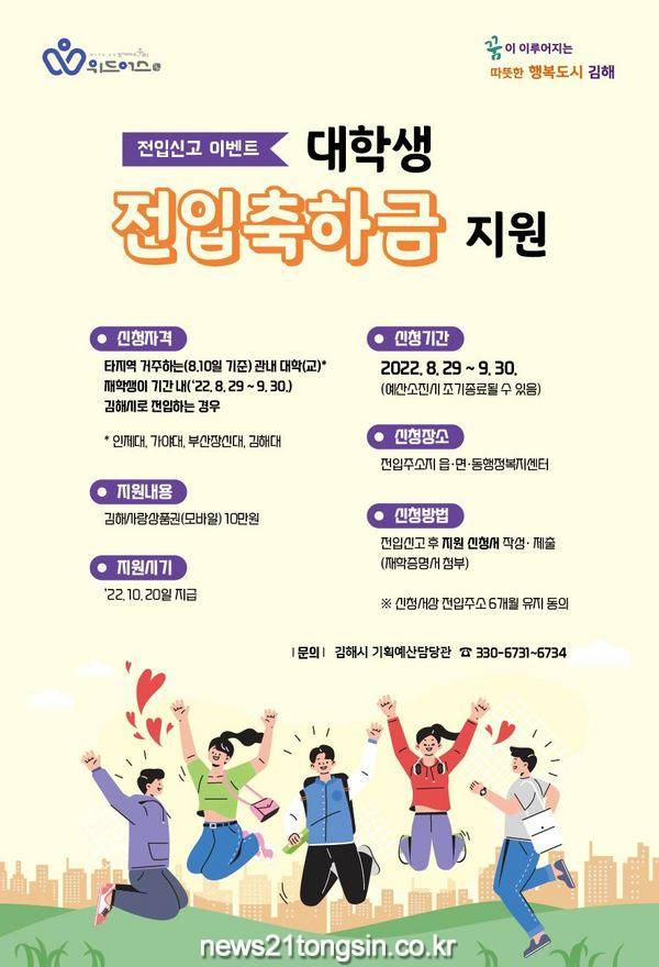 김해시가 관내 대학 2학기 개강시기에 맞추어 전입신고 이벤트를 추진한다 이번 이벤트는 『대학생 전입축하금 지원』으로 오는 29일부터 9월 30일까지 지원 신청을 받는다고 밝혔다.