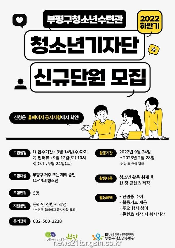 부평구(구청장 차준택)청소년수련관이 오는 9월 14일까지 ‘2022 청소년기자단 에디트’ 하반기 신규단원을 모집한다.