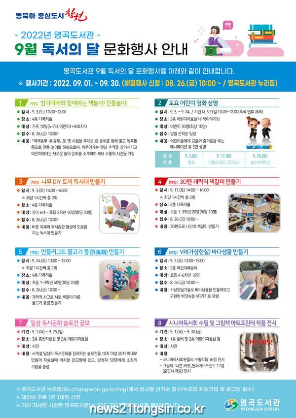 참여자 접수는 8월 26일 오전 10시부터 명곡도서관 누리집(lib.changwon.go.kr/mg)에서 행사별 선착순으로 진행되며, 기타 자세한 사항은 누리집이나 전화(☎ 225-7320, 7321)으로 문의하면 된다.