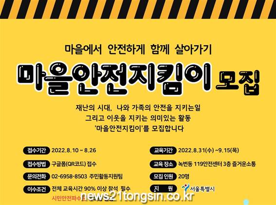 서울 은평구(구청장 김미경)은 마을에서 안전하게 함께 살아가기 위한 ‘마을안전지킴이’를 오는 26일까지 모집한다.