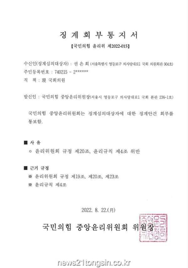 권 의원은 오늘(23일) SNS를 통해 윤리위의 ‘징계회부통지서’를 공개하며 “사유가 적시되지 않아 확인해보니 경찰국 신설 반대 논의와 이상민 행정안전부 장관 탄핵 주장이라고 한다”며 이 같이 밝혔다.