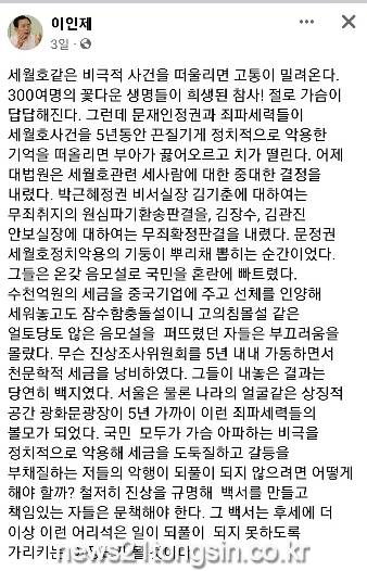 지난 20일 이인제 전 국회의원이 본인 SNS을 통하여 문재인 정권이 세월호를 정치적으로 악용하였다며 비판하였다.