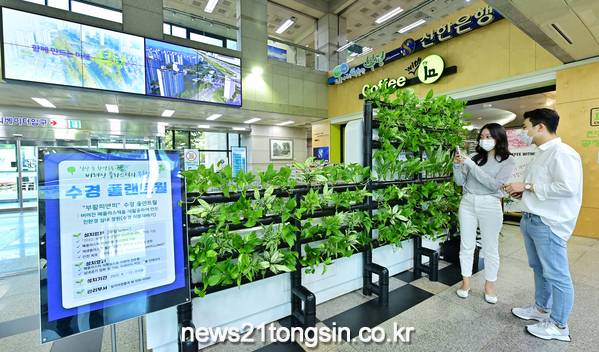 부평구청 1층이 초록 공간으로 변신했다. 4일 부평구(구청장 차준택)에 따르면 청사 1층에 폐플라스틱을 재활용해 만든 식물재배기 ‘수경 플랜트월’이 지난 23일 설치됐다.