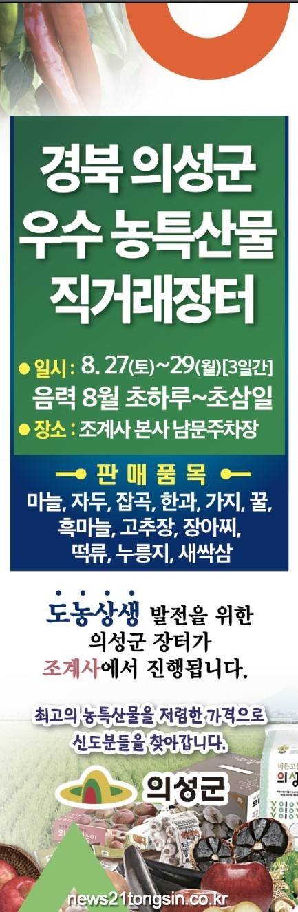 의성군은 지역 우수 농특산물의 대도시 홍보 및 판매 활성화를 위해 음력 8월 초하루 법회를 맞아 8월 27일(토)부터 3일간 조계사 경내에서 의성군 우수 농특산물 직거래장터를 개최한다고 밝혔다.