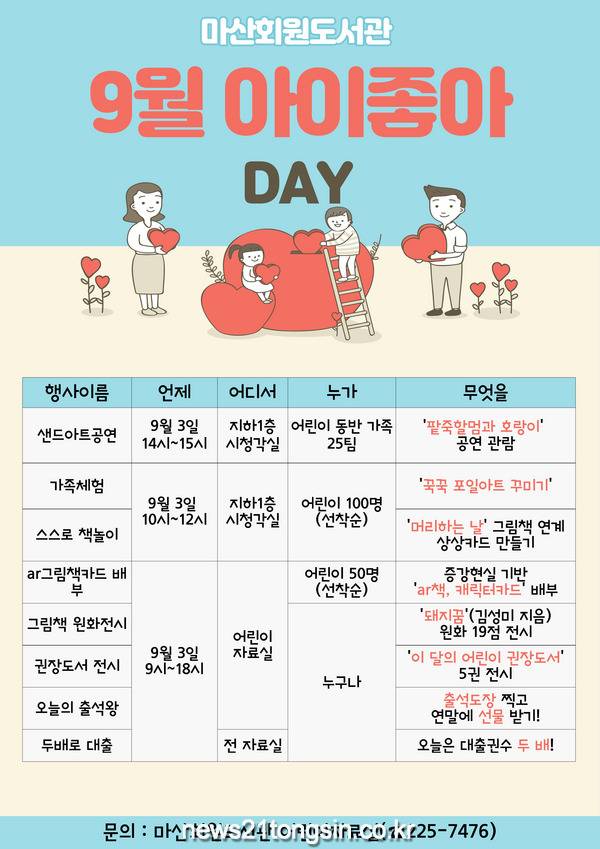 이번 9월 「아이 좋아 도서관」은 첫째 토요일인 3일에 ▲1개의 공연행사와 ▲2개의 체험행사 그리고 ▲「돼지꿈(김성미 지음)」 원화 전시, ▲증강현실 기반 ar책, 캐릭터카드 배부, ▲이달의 권장 도서 전시 등의 행사를 운영한다.
