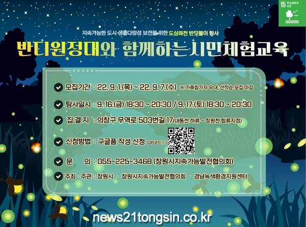 최종 선발된 시민 조사단은 9월 16일과 17일 양일간 곤충전문가와 동행하여 창원 도심하천인 내동천 일원에 서식하는 반딧불이 불빛을 직접 관찰 할 수 있는 야외탐사 활동을 실시할 계획이다.