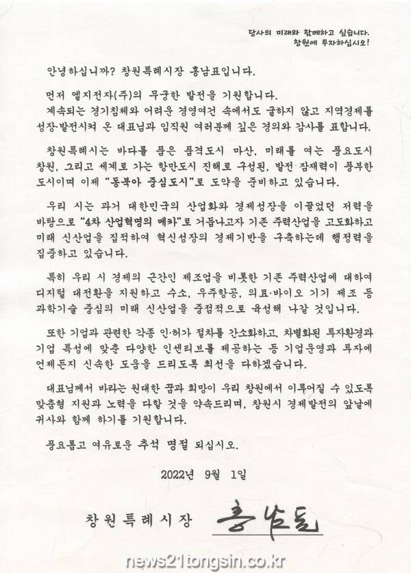 창원특례시(시장 홍남표)는 5일 기업투자 유치에 대한 의지를 표방하고 관련 지원제도를 안내하기 위해 관내·외 기업 200여개사에 시장 서한문과 홍보물을 발송했다.