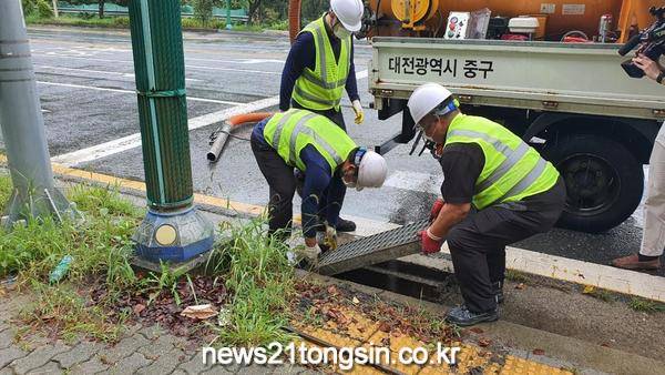 이에 따라 오전부터 대전시·자치구 직원들은 도로변 빗물받이 배수구점검, 공사현장 가림막, 가시설물, 비산적치물 철거 고정상태, 현수막 등 광고물 제거, 그늘막 안전관리 상태, 옹벽, 축대, 급경사지 산사태 등 위험취약시설에 대한 추가 점검을 진행하고 있다.