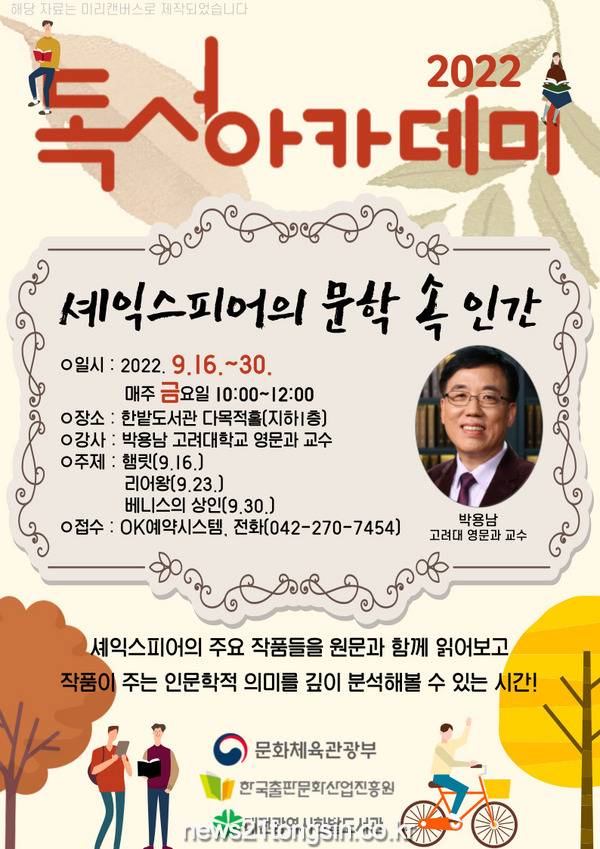 대전한밭도서관은 ‘2022년 독서아카데미’ 4차 강연을 오는 9월 16일, 23일, 30일 3회에 걸쳐 개최한다고 밝혔다.