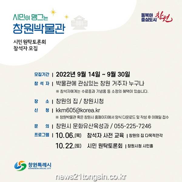 시민 원탁토론회는 창원 만의 이야기를 담기 위해 시민들이 함께 모여 생각을 모으고 토론하여 의견을 제안하는 행사이다. 참석자 모집기간은 14일부터 30일까지로 박물관에 관심있는 창원 거주자이면 누구나 신청가능하다. 창원시 혹은 창원박물관 홈페이지(www.cwmuseum.or.kr)에서 지원 신청서 양식을 다운로드 받아 작성후 이메일로 제출하면 된다.