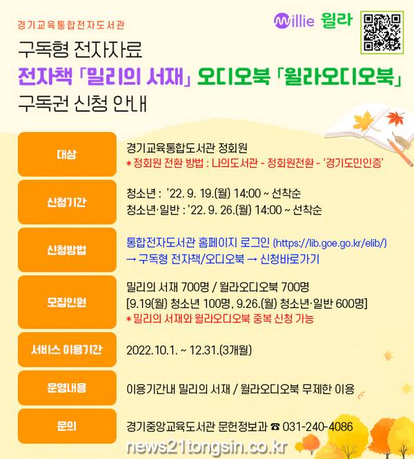 이 서비스는 경기도민이 ‘밀리의 서재’와 ‘윌라오디오북’의 다양한 독서콘텐츠를 무료로 이용할 수 있도록 구독권을 제공하는 것이다.