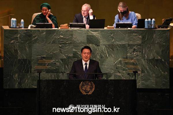 윤석열 대통령은 유엔총회 첫날, 정상급 인사 가운데 10번째로 연단에 올랐다.