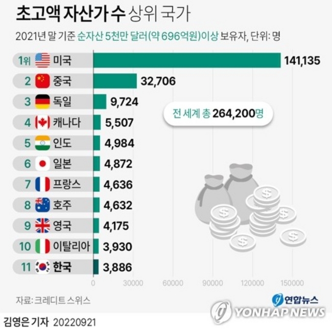 순자산이 5천만 달러, 약 7백억 원이 넘는 초고액 자산가도 미국과 중국, 독일 등에 이어 11번째로 많은 것으로 집계됐다.