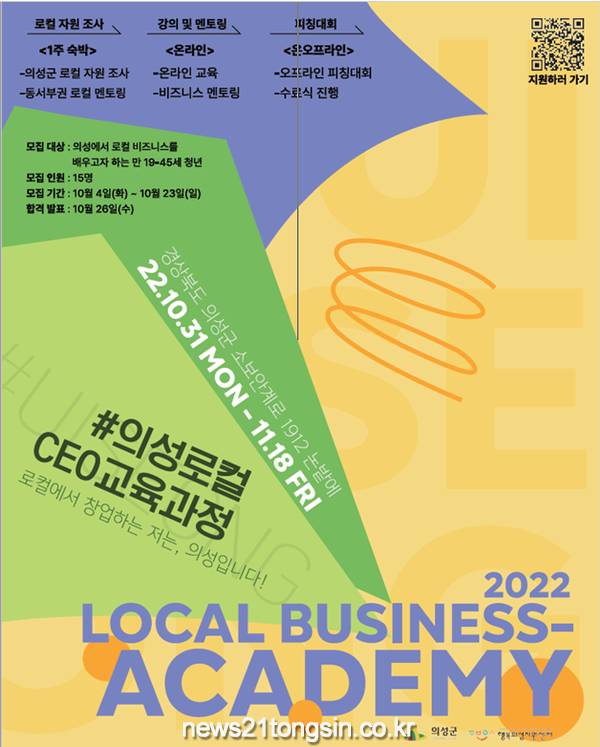 의성군은 10월 4~23일까지 3주 간 지역 내 창업을 희망하는 청년들의 원활한 준비를 도모하기 위해 예비창업가 대상‘ 로컬비즈니스 아카데미’ 3기 교육생 15명을 모집한다.