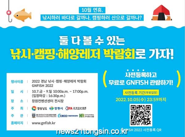경남 낚시·캠핑·해양레저 박람회는 10월 5일까지 행사 홈페이지(gnfish.kr)에서 온라인 사전 등록을 통해 무료로 입장 가능하며, 기타 자세한 문의 사항은 GNFISH 2022 사무국(055-212-1012~3)으로 문의하면 된다.