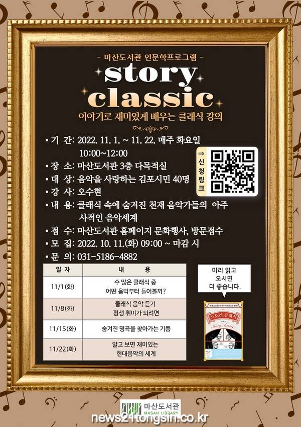 김포시 마산도서관에서 깊어가는 계절 가을에 어울리는 인문학프로그램 ‘스토리 클래식’을 운영한다.