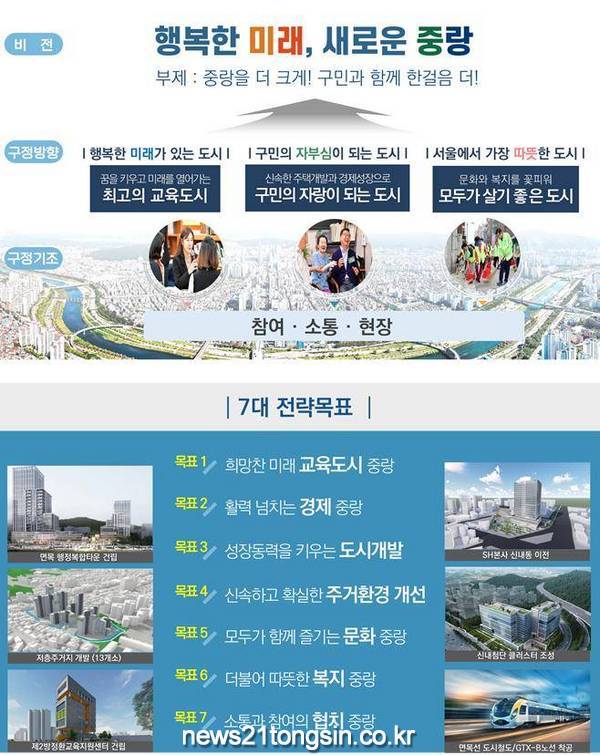 주요 사업으로는 제2방정환교육지원센터와 천문과학관 건립, 패션봉제산업클러스터 조성, 면목행정복합타운 건립, 면목선 경전철 조기 개통 등이 있다. 이외에도 따뜻한 산후조리 서비스 확대와 어르신 맞춤형 건강관리사업 등 영유아부터 노년에 이르기까지 모든 연령대의 주민이 체감할 수 있는 생활밀착형 사업도 선정했다.